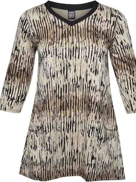 geschnitten ist diese Tunika Melina von Pont Neuf, aus einem leicht elastischem Jersey in schwarz beige sand, herrlich bequem, nichts zeichnet sich ab. Die Ärmel sind 3/4 lang. Die Tunika hat V-Ausschnitt an der vorderen Mitte. An den Seitennähten sind Taschen eingearbeitet. Länge der Tunika in Gr. XXL ca. 90 cm.