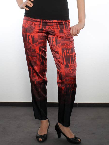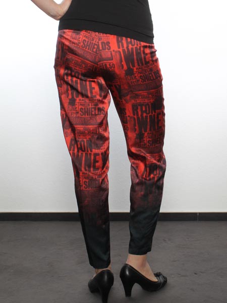 heißt das Gemälde von Ayline Olukman, mit dem der Stoff dieser Hose von Aventures des Toiles allover in schwarz/rot bedruckt ist, im Farbverlauf von hell nach dunkel. Die Hose wird seitlich mit Reißverschluß geschlossen. Länge der Hose ca. 101 cm. 1/2 Fußweite am Knöchel ca. 15,5 cm.