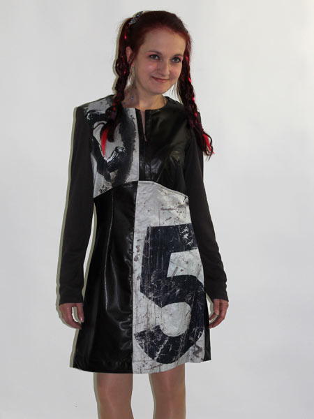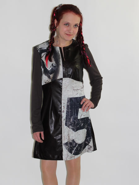 heißt das Gemälde, mit dem der gewebte Stoff dieses schicken Kleid von Aventures bedruckt ist. Es ist tailliert, hat Empirenaht, ist zum Saum hin leicht ausgestellt. Das Kleid hat am Halsausschnitt einen RV. Das Rückenteil und die braunen Partien am Vorderteil sind aus Kunstlederimitat. Die Ärmel sind aus braunem Jersey. Länge des Kleides ca. 86 cm.