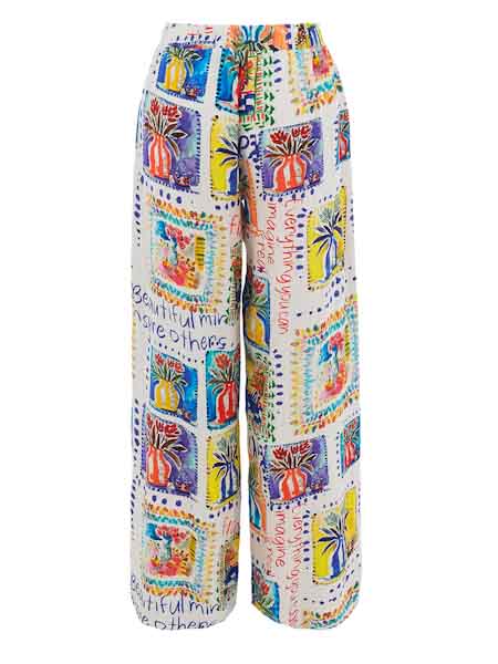 ist die Malerin des Gemäldes, mit dem der Webstoff aus Viscose/Leinen dieser lässigen Hose von Dolcezza bedruckt ist, Kunst und Mode aus Kanada. Sie hat weite Hosenbeine wie eine Marlenehose. Der 4 cm hohe Taillenbund hat an der hintern Hose einen breiten Gummidurchzug, superbequem. Die Stoffbänder zum Knoten sind nur Zierde an der vorderen Hose. Die vorderen Hosenbeine haben an der Mitte einen Schlitz ab Kniehöhe. Innere Beinlänge ca. 80 cm. Länge incl. Bund in Gr. M ca. 104 cm.