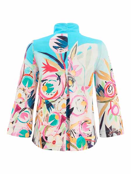 ist die Malerin des Gemäldes, mit dem der etwas dickere Baumwolljersey dieser Jacke von Dolcezza bedruckt ist, Kunst und Mode aus Kanada. Die Jacke hat einen hohen Stehkragen, wird vorn mit fliederfarbenen Knöpfen geschlossen. Sie ist im A-Schnitt gearbeitet, zum Saum hin leicht ausgestellt, leicht oversized geschnitten. Sie hat an der hinteren Mitte eine nach unten aufspringende Falte. Die Jacke hat 2 Taschen in den Teilungsnähten. Die Ärmel sind 7/8 lang. Länge in Gr. L ca. 68 cm.