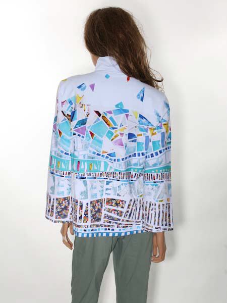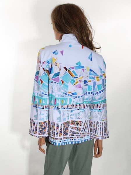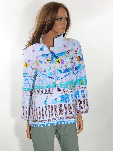 ist die Malerin des Gemäldes, mit dem der etwas dickere Baumwolljersey dieser Jacke von Dolcezza bedruckt ist, Kunst und Mode aus Kanada. Die Jacke hat einen hohen Stehkragen, wird vorn mit großen weißen Knöpfen und Schlaufen geschlossen. Sie ist leicht oversized geschnitten, etwas tailliert. Die Jacke hat 2 senkrechte Eingrifftaschen. Die Ärmel sind 7/8 lang. Länge in Gr. M ca. 65 cm.