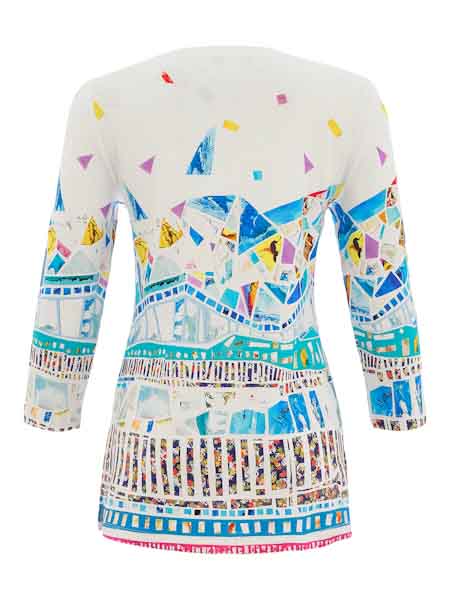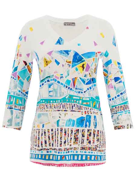 ist die Malerin des Gemäldes, mit dem der Viscosejersey dieser Tunika, dieses langen Shirts von Dolcezza bedruckt ist, Kunst und Mode aus Kanada. Es hat einen gerundeten V-Ausschnitt, die Ärmel sind 3/4 lang. Das Shirt ist leicht tailliert. Es hat an den Seitennähten Schlitze. Länge in Gr. M ca. 70 cm.