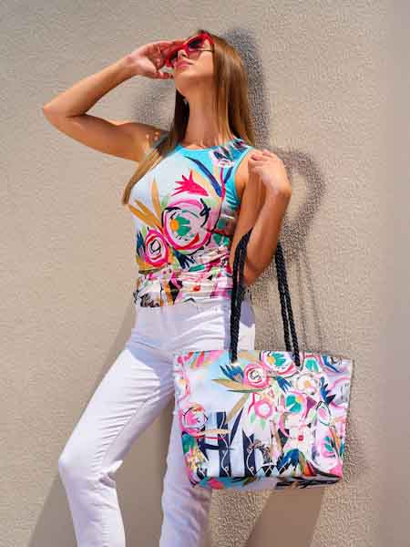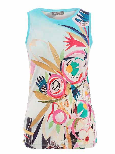 ist die Malerin des Gemäldes, mit dem der Viscosejersey dieses Tops von Dolcezza bedruckt ist, Kunst und Mode aus Kanada. Es hat einen flachen Halsausschnitt. Die Ausschnittblenden an Hals- und Armausschnitten sind uni türkis. Der obere Part des Vorderteils ist betont mit transparenten aufgebügelten Steinchen. Das Top ist leicht tailliert. An den Seitennähten ist ein Gummi durchgezogen, damit können Sie das Top in der Länge raffen. Länge in Gr. L ca. 68 cm an der vorderen Mitte.