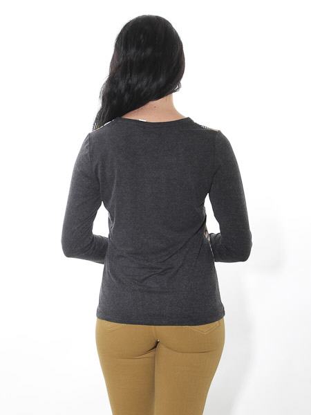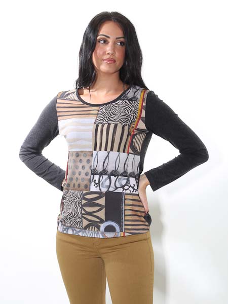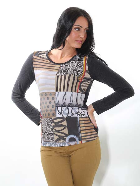 mit dem Gemälde "Poetic Metaphor" der Kunstmalerin Janet O'Neal ist der elastische Viscosejersey am Vorderteil dieses Shirts von Dolcezza, Kunst und Mode aus Kanada. Rückenteil, die Ärmel und die Halsausschnitt sind aus anthrazithmelangefarbenem Jersey. Es ist leicht tailliert. Länge in Gr. M ca. 64 cm