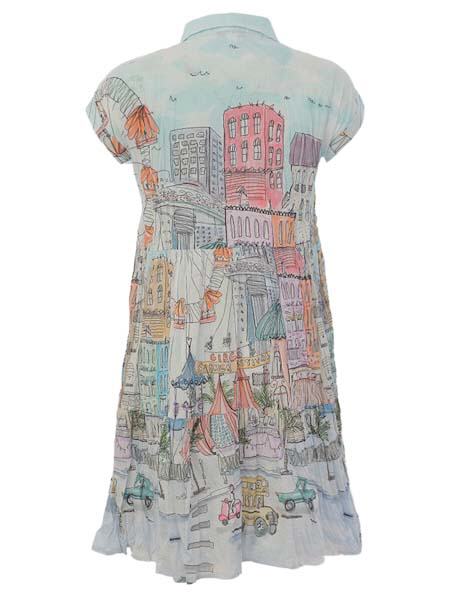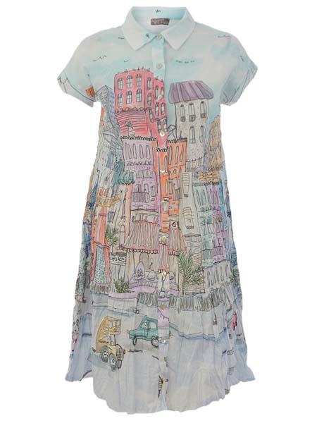 ist die Malerin des Gemäldes, mit dem der gecrashte Baumwollwebstoff dieses Kleides von Dolcezza bedruckt ist, Kunst und Mode aus Kanada. Es hat einen Hemdblusenkragen, ist an der vorderen Mitte durchgeknöpft mit Perlmuttknöpfen. Es hat eine Taillennaht, der Stoff ist darunter leicht angekraust. Zum Saum hin ist das Kleid herrlich weit. Die Schultern sind überschnitten. Länge in Gr. S ca. 94 cm.