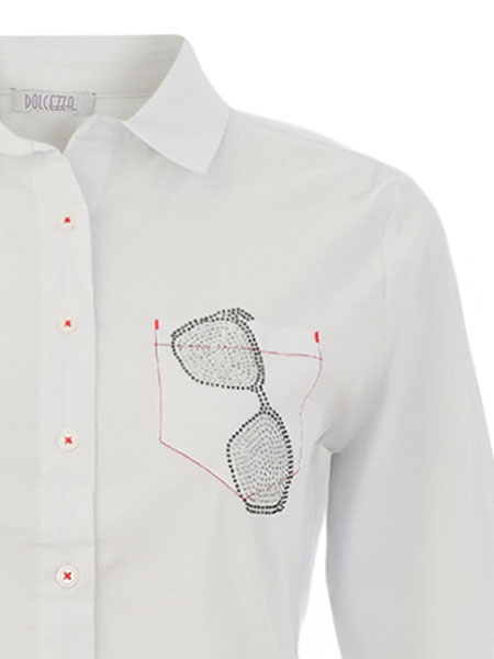 ist das Thema, zu dem diese weiße Bluse von Dolcezza gehört. Sie hat einen Hemdblusenkragen, ist vorn durchgeknöpft mit weißen Knöpfchen. Die Brusttasche ist in rot aufgesteppt, die Sonnenbrille ist geformt aus aufgebügelten schwarzen und silbernen Steinchen. Das Rückenteil ist bedruckt mit Motiven aus der Modewelt, einige Buchstaben sind geformt aus silbernen Steinchen. Die langen Ärmel haben Manschetten mit Knopfverschluß. Sie sind rot abgesteppt. Die Saumkanten sind gerundet. Länge in Gr. S ca. 67 cm.