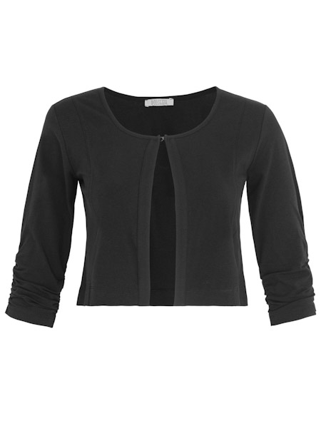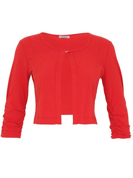 ist das Thema, zu dem diese taillenkurze Bolerojacke von Dolcezza gehört. Wir haben sie in den Farben schwarz und rot vorrätig. Sie hat einen V-Ausschnitt, wird in Brusthöhe mit einem kleinen silbernen Knopf geschlossen. Die Bolerojacke können Sie gut als kleine Sommerjacke über Tops und ärmellose Kleider tragen. Sie ist leicht tailliert. Länge in Gr. S ca. 50 cm.