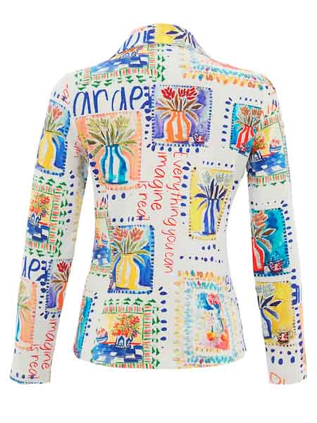 ist die Malerin des Gemäldes, mit dem der etwas dickere Baumwolljersey dieser Jacke von Dolcezza bedruckt ist, Kunst und Mode aus Kanada. Sie ist wie ein Blazer geschnitten, hat einen Reverskragen, wird vorn geschlossen mit 2 silbernen geprägten Knöpfen. Sie ist tailliert, hat senkrechte Teilungsnähte. Länge in Gr. S ca. 64 cm.