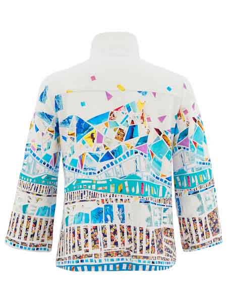 ist die Malerin des Gemäldes, mit dem der etwas dickere Baumwolljersey dieser Jacke von Dolcezza bedruckt ist, Kunst und Mode aus Kanada. Die Jacke hat einen hohen Stehkragen, wird vorn mit großen weißen Knöpfen und Schlaufen geschlossen. Sie ist leicht oversized geschnitten, etwas tailliert. Die Jacke hat 2 senkrechte Eingrifftaschen. Die Ärmel sind 7/8 lang. Länge in Gr. S ca. 65 cm.