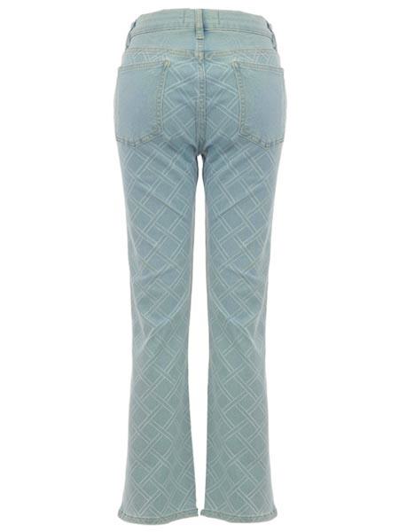 geschnitten ist diese hellblaue 5-pockets-Jeans von Dolcezza, Kunst und Mode aus Kanada, stonewashed. Sie ist hinten hoch geschnitten, ist 7/8 lang. Der Denim ist herrlich weich und elastisch. Der Denim ist an den vorderen und hinteren Beinen hellgrau mit Rhomben bedruck. Der Taillenbund, die Passe und die Potaschen sind nicht bedruckt. Die Hosenbeine sind gerade geschnitten mit einer 1/ Saumweite von 21 cm. Innere Beinlänge 67 cm, Länge incl. Bund in Gr. S ca. 90 cm.