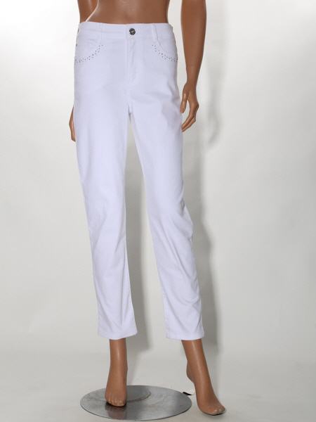 ist das Thema, zu dem diese lange Hose von Dolcezza gehört. Sie ist wie eine 5-pockets-Jeans gearbeitet, knöchellang. Wir haben sie nur noch in der Farbe weiß, aus Denim gearbeitet. Sie hat Gürtelschlaufen, wird mit einem geprägten Metallknopf geschlossen. Sie hat vorn 2 Eingrifftaschen, betont mit silbernen Steinchen. Sie hat 2 aufgesetzte Po-Taschen, auch mit silbernen Steinchen geschmückt. kurze Schlitze an den Seitennähten. 1/2 Saumweite = 16,5 cm. Länge incl. Bund in Gr. S ca. 97 cm.