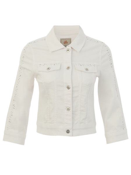 ist das Thema, zu dem diese Jeansjacke von Dolcezza gehört. Wir haben sie in den Farben koralle, weiß und in hellblau vorrätig, aus Denim gearbeitet. Sie ist im Stil einer Jeansjacke geschnitten, hat einen Kragen, wird mit Metallknöpfen geschlossen. Sie hat 2 Pattentaschen auf den Vorderteilen, betont mit kleinen Strasssteinen. Die 3/4 langen Ärmel haben Manschetten. Die senkrechte Mitte der Ärmel ist betont mit silbernen Steinchen. Die schicke Jacke ist gut tailliert, fällt sehr knapp aus. Länge in Gr. S ca. 50 cm.