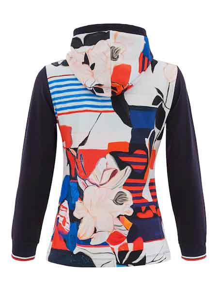 ist die Malerin des Gemäldes, mit dem der etwas dickere Baumwolljersey dieser sportlichen Jacke von Dolcezza bedruckt ist an Vorder- und Rückenteil sowie an der großen Kapuze, Kunst und Mode aus Kanada. Die langen Ärmel sind uni blau, haben als Abschluß Rippenbündchen gestreift in dunkelblau, rot und weiß. Die Kapuze ist dunkelblau gefüttert. Die Weite der Kapuze können Sie mit blauen Bändern raffen. Die Jacke wird vorn geschlossen mit 2 silbernen Druckknöpfen. Sie ist tailliert, hat senkrechte Teilungsnähte, hat 2 Taschen in den Teilungsnähten. Länge in Gr. S ca. 67 cm.