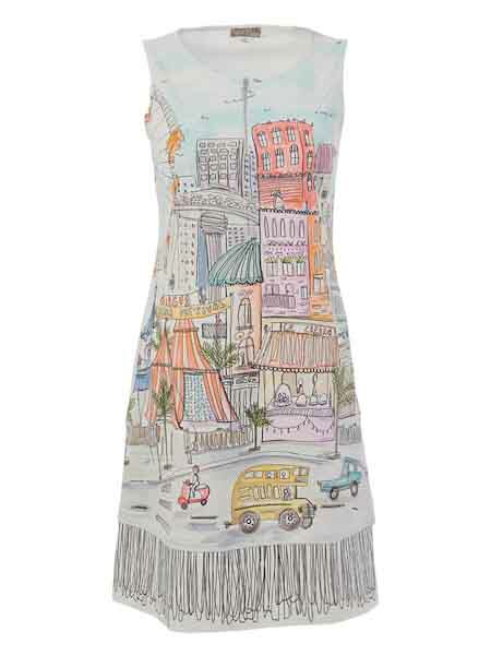 ist die Malerin des Gemäldes, mit dem der etwas dickere Baumwolljersey dieses Kleides von Dolcezza bedruckt ist, Kunst und Mode aus Kanada. Es hat einen runden Halsausschnitt, an der vorderen Mitte einen kurzen silbernen Metallreißverschluß. Es ist leicht tailliert, zum Saum hin ein wenig ausgestellt. In den Teilungsnähten sind 2 Taschen versteckt. Länge in Gr. S ca. 96 cm.