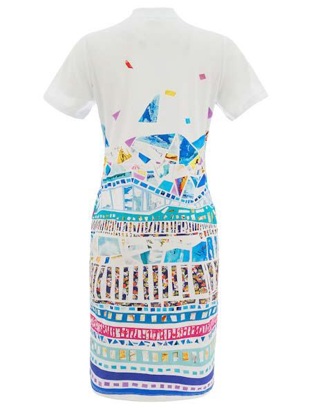 ist die Malerin des Gemäldes, mit dem der Baumwolljersey dieses Kleides von Dolcezza bedruckt ist, Kunst und Mode aus Kanada. Es hat am Rückenteil eine Taillennaht, vorn hat es eine hochgezogene Empirenaht. Es hat einen V-Ausschnitt, parallel dazu ist der Stoff in Falten gelegt bis zur vorderen Mitte an der Empirenaht. Das Kleid ist tailliert, zum Saum hin gerade geschnitten. Die kurzen Ärmel sind uni weiß. Länge in Gr. S ca. 95 cm.