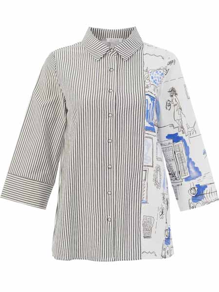 ist das Thema, zu dem diese lange Bluse von Dolcezza gehört. Sie hat einen Hemdblusenkragen, ist vorn durchgeknöpft mit weiß/grauen Knöpfchen. Sie ist teilweise aus längs gestreiftem Stoff in weiß dunkelgrau und teilweise aus einem weißen Stoff, bedruckt in antra mit jeansblau. Vorder- und Rückenteil sind leicht A-förmig geschnitten. Die Ärmel sind 3/4 lang, bequem weit am Saum. Länge in Gr. S ca. 72 cm.