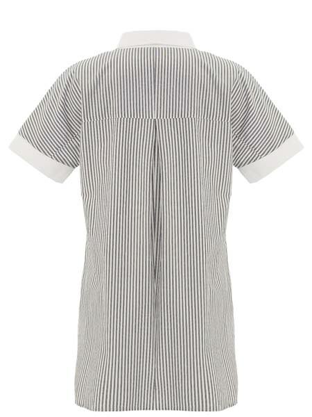 ist das Thema, zu dem diese lange Bluse von Dolcezza gehört. Sie hat einen Hemdblusenkragen, ist vorn durchgeknöpft mit schwarzen Knöpfchen. Kragen und Vorderteile sind uni weiß. Die Vorderteile sind bedruckt mit Motiven aus der Modewelt im Flockprint. Das Rückenteil ist aus längs gestreiftem Stoff in weiß dunkelgrau. Die Schultern sind weit überschnitten, haben als Abschluß einen weißen Aufschlag. Die Bluse hat am Rückenteil eine aufspringende Falte, was eine bequeme Weite am Saum ergibt. Das Rückenteil ist länger als das Vorderteil. Die Saumkanten sind gerundet. Länge in Gr. S ca. 76 cm vorn und ca. 82 cm hinten.