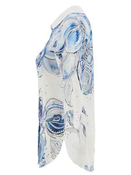 ist die Malerin des Gemäldes, mit dem der Leinenstoff dieser lässigen Bluse von Dolcezza bedruckt ist, Kunst und Mode aus Kanada. Sie hat einen Hemdblusenkragen, ist vorn durchgeknöpft mit weißen Knöpfen. Die Ärmel sind 3/4 lang, sie hat Aufschläge. Die Bluse ist tailliert mit Teilungsnähten, sie hat kurze Schlitze, die Saumkanten sind gerundet. können Sie auch gut als kleine Sommerjacke über Tops oder wie auf dem Foto, über ein ärmelloses Kleid tragen. Länge in Gr. S ca. 72 cm.