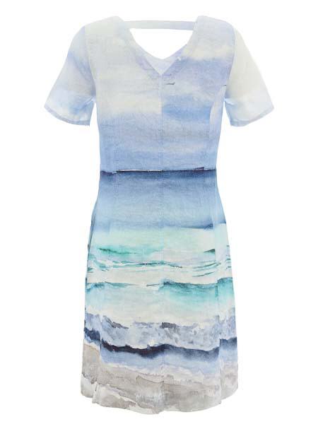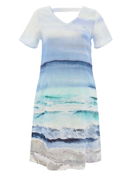 ist die Malerin des schönen Gemäldes, mit dem der Leinenstoff dieses Kleides von Dolcezza bedruckt ist, Kunst und Mode aus Kanada. Es hat vorn und hinten einen V-Ausschnitt, am Rückenteil wird der Ausschnitte mit einem horizontalem Stoffstreifen zusammen gehalten. Das Kleid ist etwas tailliert und ist zum Saum hin leicht ausgestellt. Es hat Taschen in den Seitennähten. die Ärmel sind kurz. Länge in Gr. S ca. 100 cm.