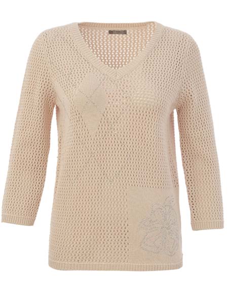 ist das Thema, zu dem dieser grob gestrickte Lochmusterpulli aus Baumwolle von Dolcezza gehört. Wir haben ihn in der Farbe hellblau, sand und in rosa vorrätig. Im Lochmuster sind am Vorderteil rechts Rechtecke glatt rechts eingestrickt, die betont sind mit Linien aus aufgebügelten silbernen Steinchen. Am Vorderteil links ist eine quadratische glatt rechts Fläche, auf der aus aufgebügelten Steinchen eine Blume geformt ist. Der Pulli hat einen V-Ausschnitt, ist gerade geschnitten. Alle Abschlüsse sind in Rippe gestrickt. Die Ärmel sind 7/8 lang. Länge in Gr. S ca. 64 cm.