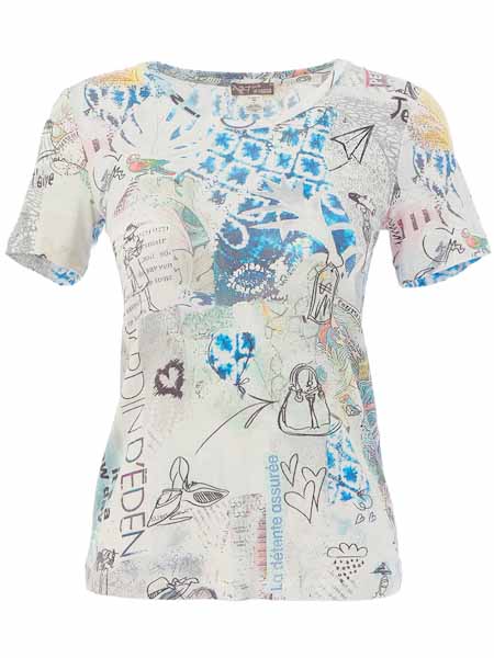 ist die Malerin des schönen Gemäldes, mit dem der Jersey dieses Shirts von Dolcezza bedruckt ist, Kunst und Mode aus Kanada. Es hat einen runden Halsausschnitt, kurze Ärmel. Es ist leicht tailliert. Der obere Part am Vorderteil ist geschmückt mit aufgebügelten transparenten Steinchen. Länge in Gr. S ca. 64 cm.