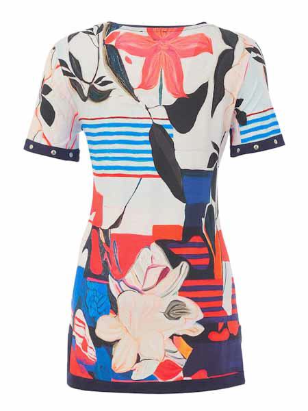 ist die Malerin des Gemäldes, mit dem der Viscosejersey dieser Tunika von Dolcezza bedruckt ist, Kunst und Mode aus Kanada. Sie hat einen V-Ausschnitt mit dunkelblauer Blende. Die kurzen Ärmel haben eine dunkelblaue Abschlußblende, betont mit silbernen Nieten. Die Tunika ist leicht tailliert. Sie hat kurze Schlitze an den Seitennähten, ebenfalls dunkelblau wie auch die Saumkante. Länge in Gr. S ca. 76 cm.
