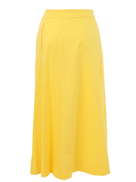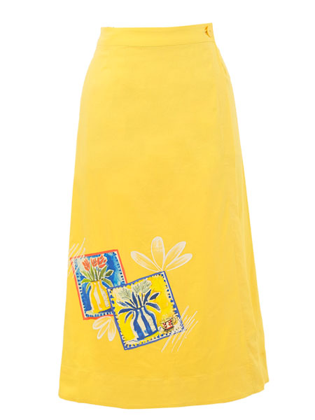 ist die Malerin des Gemäldes, mit dem das Vorderteil des gelben Wickelrockes von Dolcezza bedruckt ist, Kunst und Mode aus Kanada. Die weißen Linien sind im Flockprint gedruckt. Der Rock hat einen festen Bund, wird mit Knopf geschlossen. Er ist zum Saum hin leicht ausgestellt. Er hat Taschen in den Seitennähten. Länge in Gr. S ca. 81 cm.
