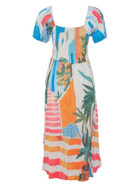 ist die Malerin des Gemäldes, mit dem der leicht gecrashte Baumwollwebstoff dieses sommerlichen Kleides von Dolcezza bedruckt ist, Kunst und Mode aus Kanada. Es hat kurze Raglanärmel, die Abschlußkanten haben einen Gummidurchzug. Am Vorderteil hat es einen V-Ausschnitt, an der vorderen Mitte ist der Stoff gerafft. Das Kleid hat am Rückenteil einen quadratischen Halsausschnitt. Der Stoff ist hinten bis zur leicht hochgezogenen Taillennaht gesmokt, was eine gute Paßform bringt. Das Rockteil ist zum Saum hin ausgestellt, herrlich an heißen Tagen. Länge in Gr. S ca. 122 cm.