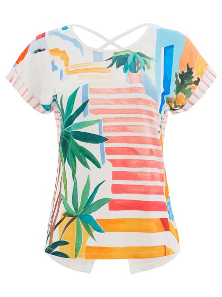 ist die Malerin des Gemäldes, mit dem der Viscosejersey am Vorderteil dieses längeren Shirts von Dolcezza bedruckt ist, Kunst und Mode aus Kanada. Der weiße Viscosejersey am Rückenteil ist verwaschen bedruckt mit himbeerfarbenen Querstreifen. Das Rückenteil hat einen tiefen V-Ausschnitt, der gehalten wird mit 2 überkreuzten weißen Bändern. Unter dem V-Ausschnitt ist eine kleine Palme aufgedruckt. Die breiten Saumkanten sind aus uni weißem Webstoff. Das Rückenteil ist etwas länger als das Rückenteil. Die Schultern sind überschnitten, haben als Abschluß eine Blende aus geringeltem Jersey in weiß himbeere. Länge in Gr. S ca. 64 cm vorn und 68 cm hinten.