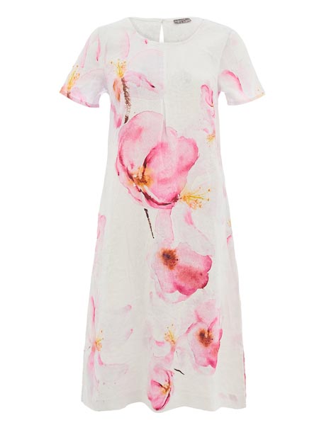 ist die Malerin des schönen Gemäldes, mit dem der Leinenwebstoff dieses sommerlichen Kleides von Dolcezza bedruckt ist, Kunst und Mode aus Kanada. Es hat einen runden Ausschnitt. An der hinteren Mitte hat es einen Schlitz mit Knopf und Öse. Es ist etwas tailliert, zum Saum hin leicht ausgestellt. Es hat Taschen in den Seitennähten. Länge in Gr. S ca. 112 cm.
