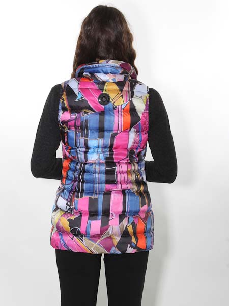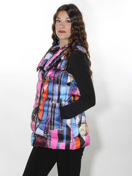 ist die Malerin des Gemäldes, mit dem der Webstoff dieser Steppweste von Dolcezza bedruckt ist, Kunst und Mode aus Kanada. Sie hat einen Kragen, wird vorn asymmetrisch mit Zipper geschlossen. Wie bei einer Bikerjacke können Sie den Kragen offen oder schlossen tragen. Die Weste ist gefüttert mit schwarzem Futterstoff. Auf den Vorderteilen sind 2 Reißverschlußtaschen. Länge in Gr. S ca. 70 cm.