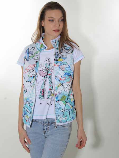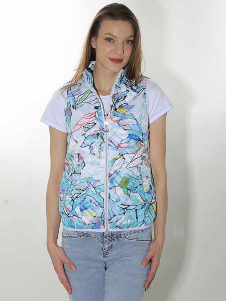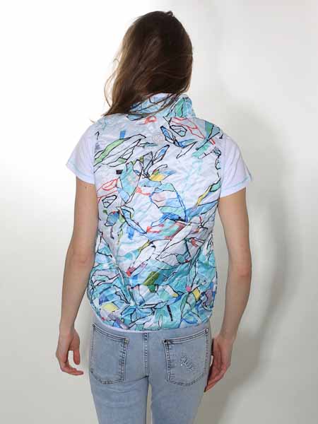 ist die Kunstmalerin des Gemäldes, mit dem der Webstoff dieser Steppweste von Dolcezza bedruckt ist, Kunst und Mode aus Kanada. Sie hat einen Stehkragen, wird vorn mit silbernem Zipper geschlossen. Die Weste ist gefüttert mit weißem Futterstoff. Die Armausschnitt- und Saumkanten sind uni weiß und leicht elastisch. Auf den Vorderteilen sind 2 Pattentaschen. Länge in Gr. S ca. 63 cm.