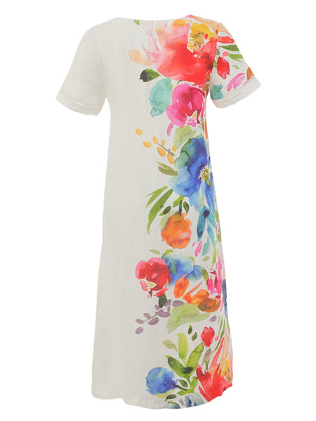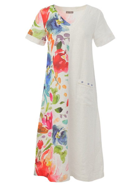 ist die Malerin des schönen Gemäldes, mit dem der weiße Leinenstoff dieses Kleides von Dolcezza bedruckt ist, Kunst und Mode aus Kanada, farbintensives Acquarell mit großen Blumen auf uni weiß. Es hat einen V-Ausschnitt, ist zum Saum hin leicht ausgestellt. Die linke Hälfte des Vorderteils, der linke Ärmel und die Ärmelabschlüsse mit Lochkante sind aus uni weißem Leinenstoff. Auch die aufgesetzte Tasche mit Lochkante ist uni weiß. Länge in Gr. S ca. 118 cm.