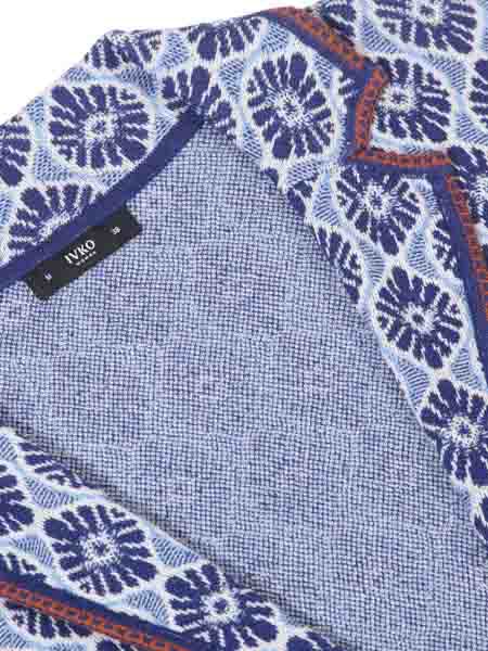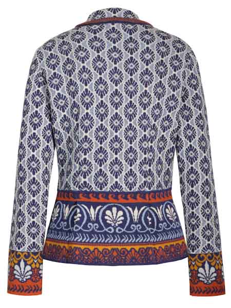 ist die Grundfarbe dieser schönen Strickjacke von Ivko, im Jacquardmuster im mediterranen Muster mit den Farben weiß, hellblau und an den Bordüren rost und senfgelb. Die Strickjacke hat einen Reverskragen wie ein Strickblazer, wird geschlossen mit dunkelblauen Knöpfen. Der Reverkragen und die Ausschnittkanten haben eine Bordürenkante in dunkelblau mit rost. Die Strickjacke hat eine Taillennaht, darunter ein Schößchen mit vorn und hinten je 2 aufspringenden Falten ab Taille. Die langen Ärmel haben eine breite Bordüre als Abschluß. Länge ca. 59 cm.