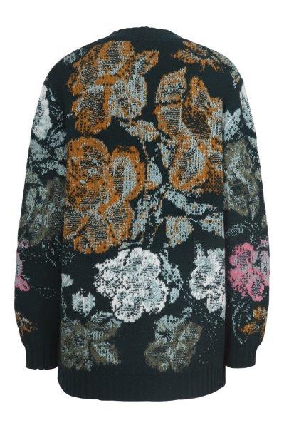 ist die Grundfarbe dieser etwas dickeren Strickjacke von Ivko im Jacquardmuster mit den Farben lindgrün, wollweiß, olivgrün, apricotund zimt. Sie hat einen V-Ausschnitt. Sie wird geschlossen mit großen Knöpfen in Grüntönen. Die Ausschnittblende und die Saumkanten sind im breiten Rippenmuster gestrickt. Die modische Strickjacke ist oversized und kastig geschnitten, nicht tailliert. Länge ca. 82 cm in Größe 38.