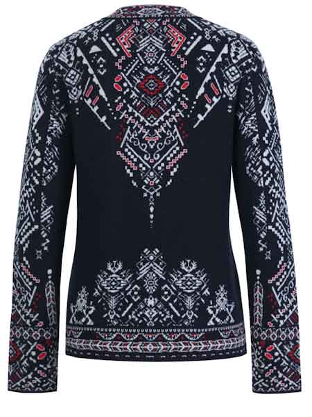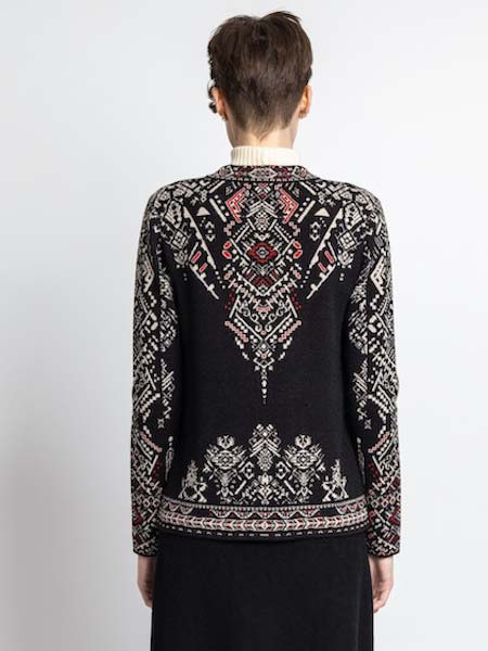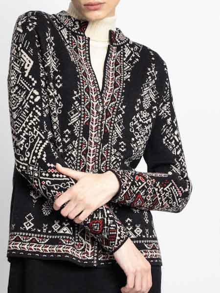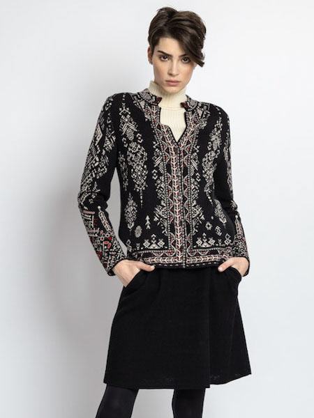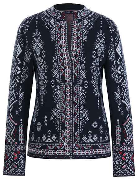 ist die Grundfarbe dieser schönen Strickjacke von Ivko, mit geometrischen Mustern und Bordüren mit weiß und ein wenig rot. Sie hat einen kleinen Stehkragen, angenehm am Hals, darunter einen Schlitz bis Brusthöhe. Sie ist durchgeknöpft mit kleinen schwarzen Knöpfen. Mit dieser eleganten Jacke aus reiner Wolle können Sie auch ausgehen! Die figurnahe Passform passt perfekt zu einem Rock oder einer schmalen Hose. Die schicke Jacke ist leicht tailliert. Die Wolle vom Merinoschaf ist herrlich weich und glatt, kratzt überhaupt nicht. Länge ca. 66 cm in Größe 44.