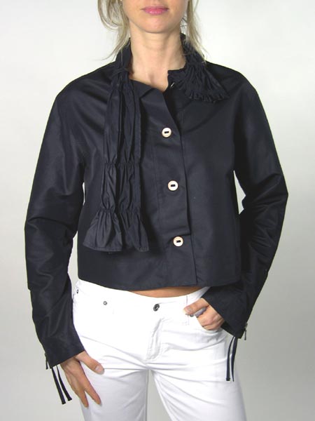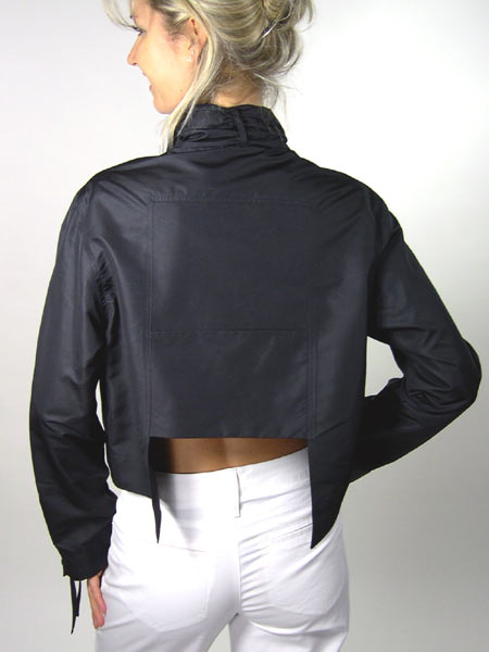 Raffiniert geschnittene Blusenjacke aus festem, glänzendem Stoff von Lauren Vidal, kurz und kastig, mit gesmokten Bändern am Kragen, Reissverschlüssen am Handgelenk. Die Blusenjacke ist am Rückenteil in der Mitte kürzer, hat eine aufgesetzte Tasche. Länge der Bluse am Vorderteil ca. 53 cm.