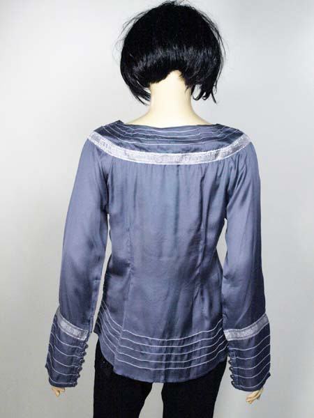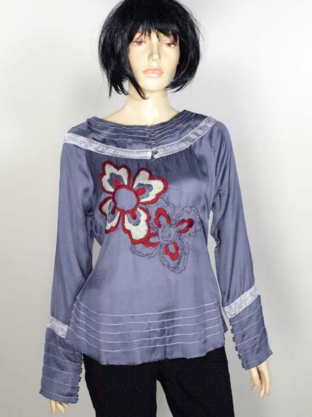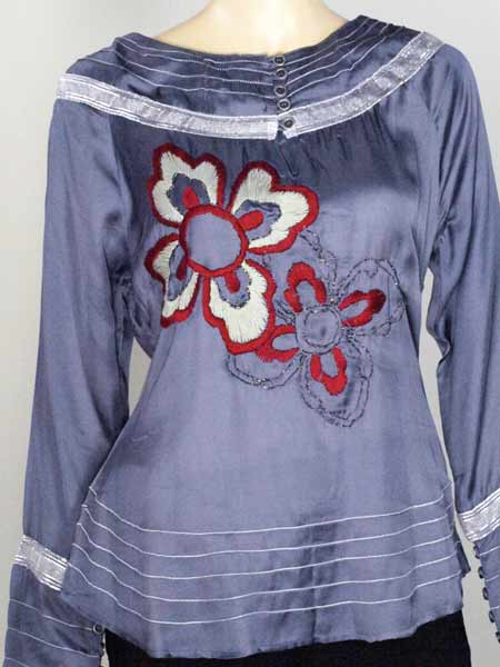 einem Stich in Jeansblau ist der glänzende Stoff dieser tollen Tunika von Staff. Sie wird an der Seite mit RV geschlossen, am Halsausschnitt und an den breiten Ärmelmanschetten wird sie mit kleinen Metallknöpfen geschlossen. Die breite Borte glänzt leicht silbern. Kunstvoll sind die aufgestickten Blumen. Länge der Tunika ca. 61 cm.