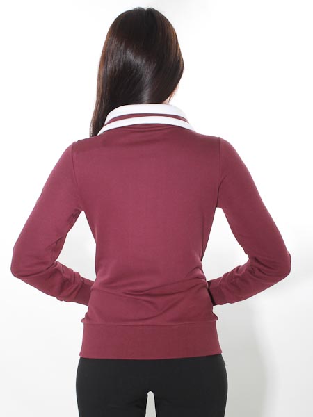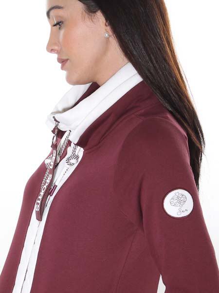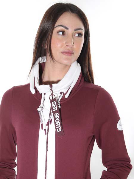 ist dieses brombeerfarbene Sweatshirt von Serena Malin aus einem dicken Jersey, innen angeraut. Es hat einen doppelten Kragen, der innere ist außen weiß und leicht wattiert, mit 2 durchgezogenen Kordeln in brombeer/weiß und weiß. Den äußerej Kragen können Sie aufstellen oder flach legen. Die Jacke wird mit Reißverschluß geschlossen, parallel zum RV verläuft eine weiße wattierte Blende. Bequem sind die 2 senkrechten Taschen. Länge ca. 64 cm in Gr. 36.